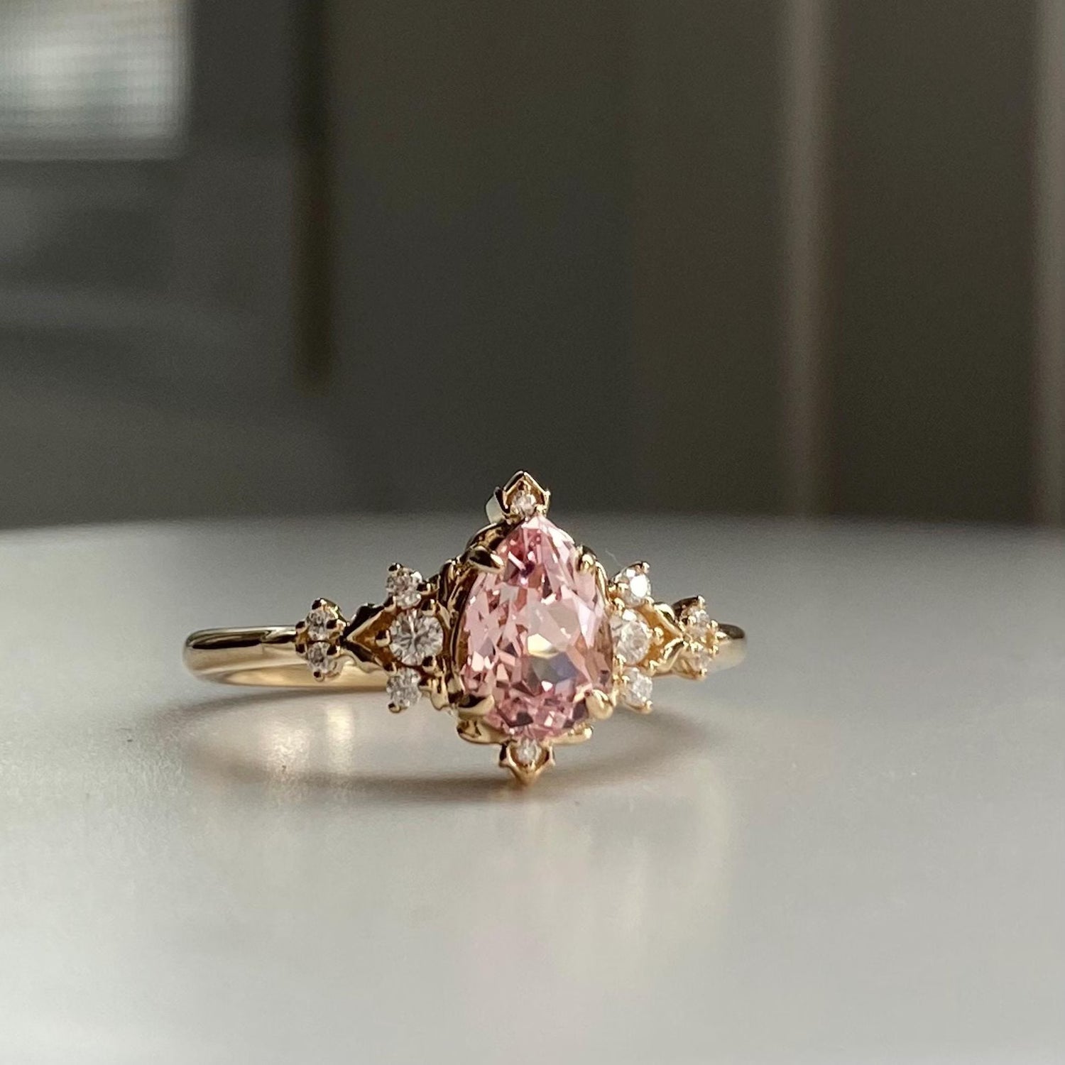 Trung tâm là viên pear cut (~5x7mm gợi ý, có thể thay đổi theo mong muốn) với dáng giọt lệ thanh thoát, bắt sáng mạnh và tạo hiệu ứng thon dài cho ngón tay.