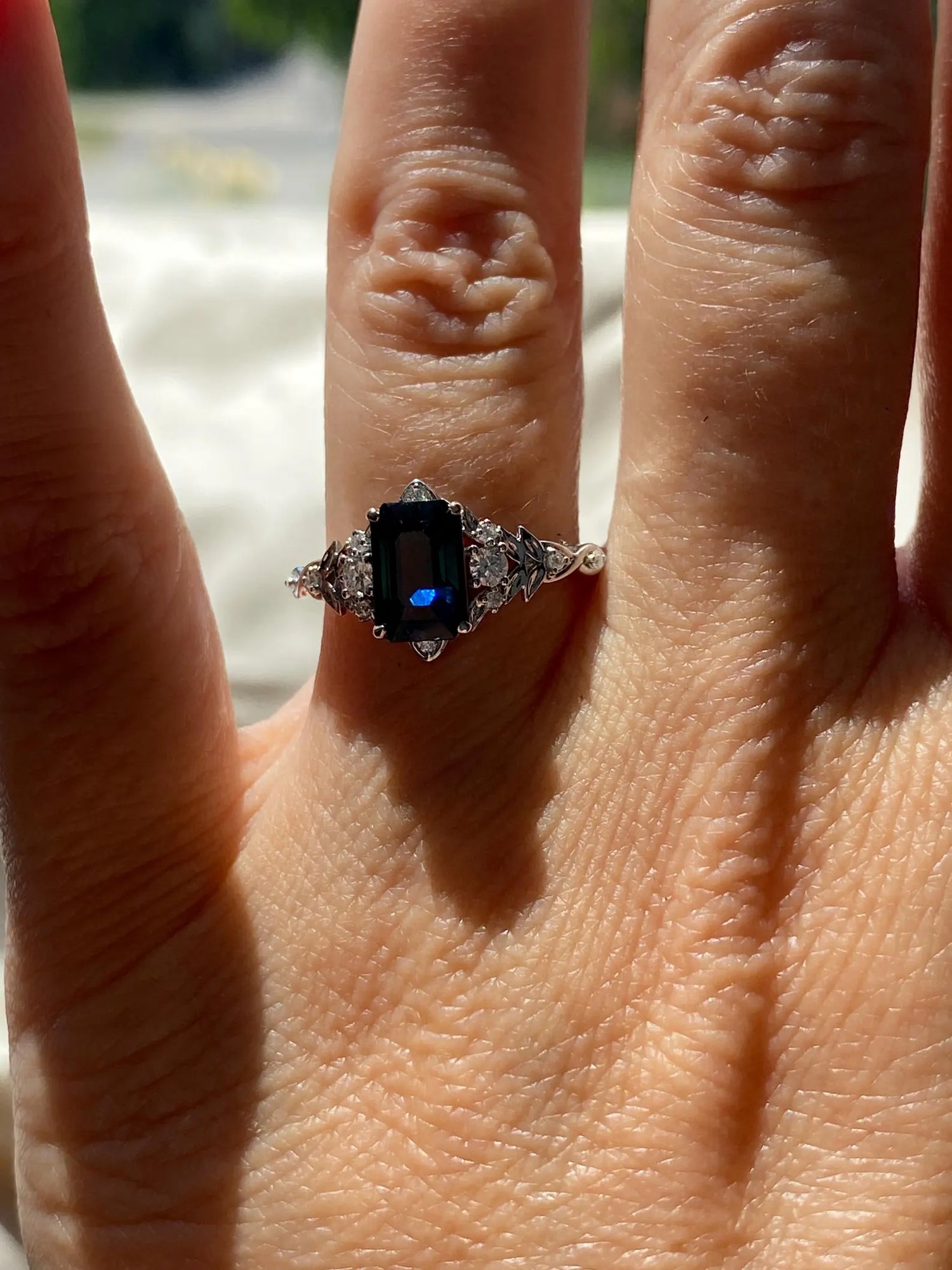 Trung tâm là viên emerald cut (~5.5x7.5mm gợi ý, có thể thay đổi theo mong muốn) với các mặt cắt dài, sắc nét tạo hiệu ứng chiều sâu mạnh mẽ. Khi ánh sáng thay đổi, viên đá phản chiếu những tầng màu đậm – đầy chiều sâu và cuốn hút.