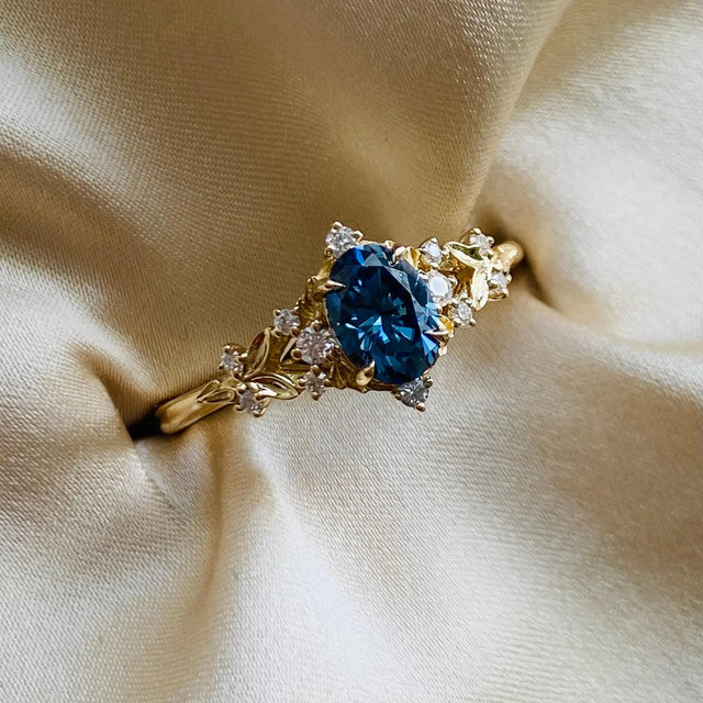 Trung tâm là viên oval cut (~5x7mm gợi ý, có thể thay đổi theo mong muốn) với sắc xanh rực rỡ và độ bắt sáng mạnh. Dáng oval giúp ngón tay trông thon dài và thanh thoát hơn.