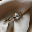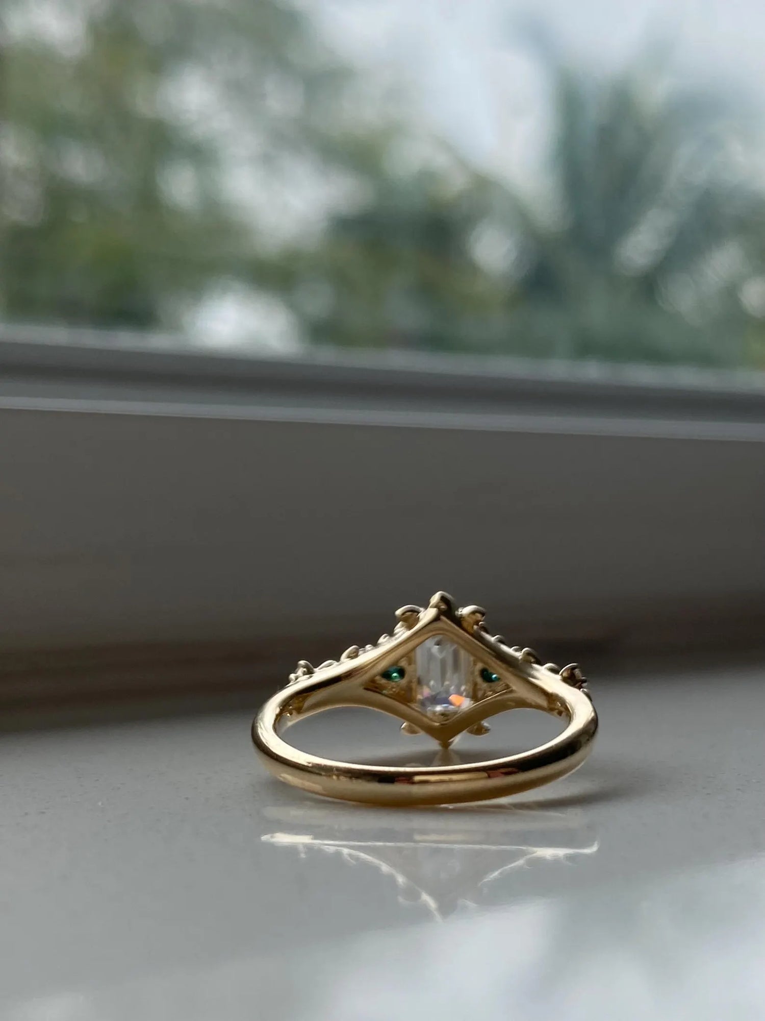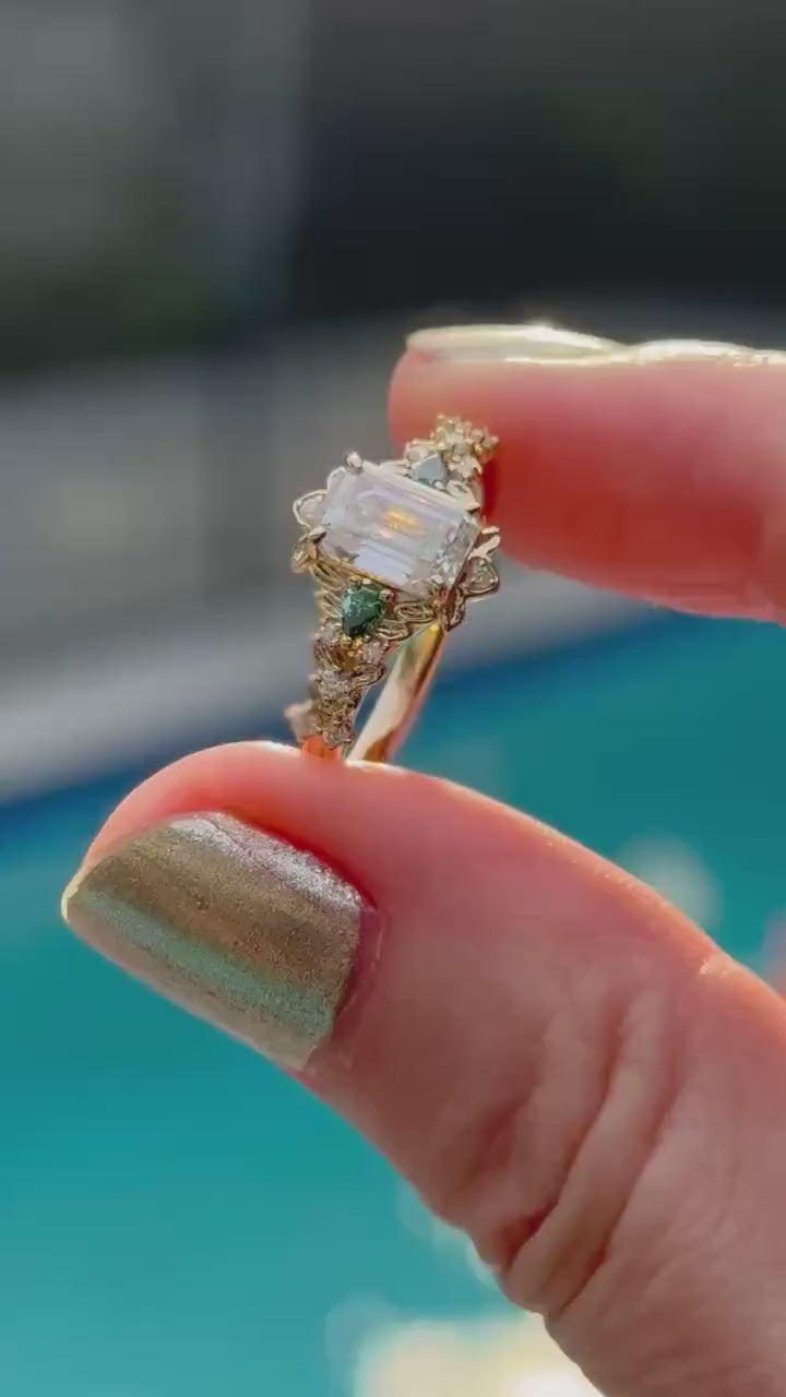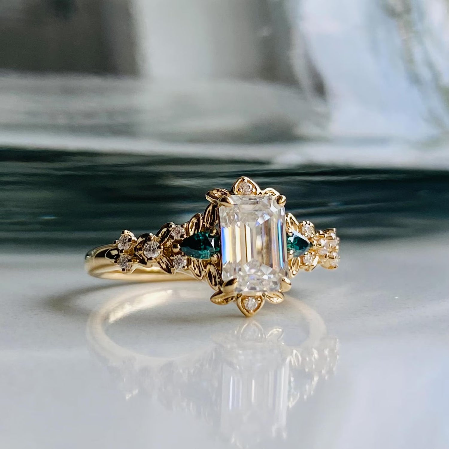 Viên chủ emerald cut 1 carat (gợi ý 5x7mm) nằm ở trung tâm, phản chiếu ánh sáng theo từng dải gương thẳng sắc nét. Bao quanh là phần chấu tạo hình cánh hoa mềm mại, mang hơi thở cổ tích và lãng mạn.