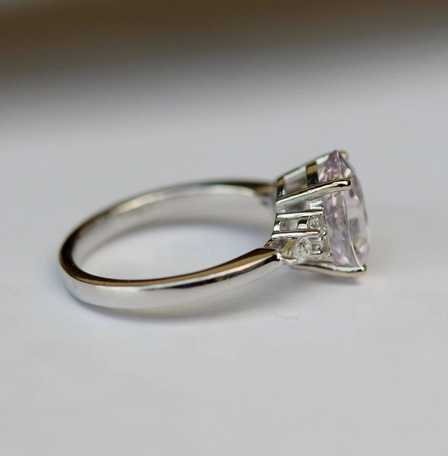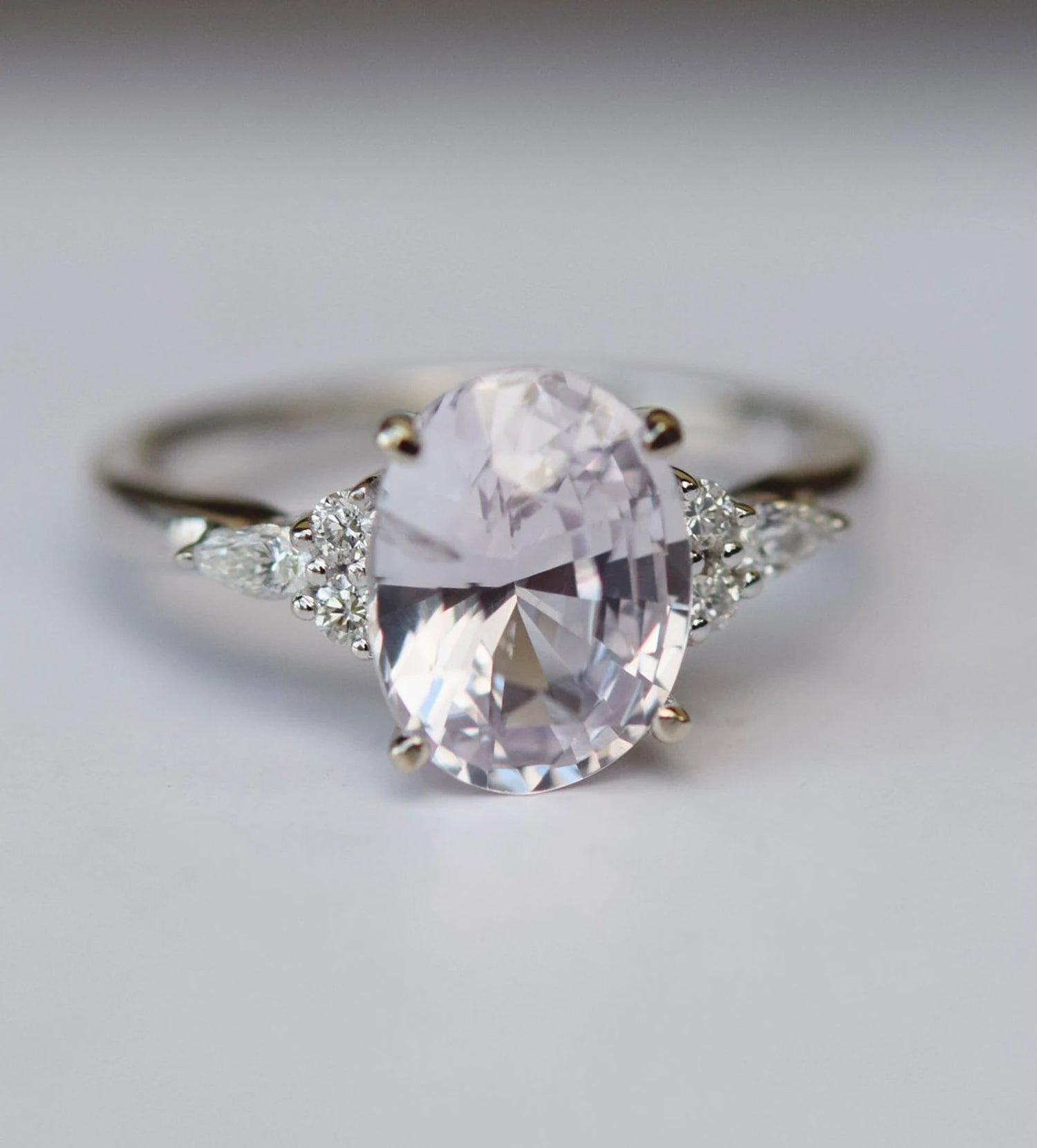 Viên đá trung tâm dáng oval cut (~6x8mm gợi ý, có thể tùy chọn lớn hơn hoặc nhỏ hơn) phản chiếu sắc tím lavender nhạt, trong trẻo và nhẹ nhàng. Dáng oval giúp tổng thể thanh thoát, tạo hiệu ứng tay dài và mềm mại hơn khi đeo.