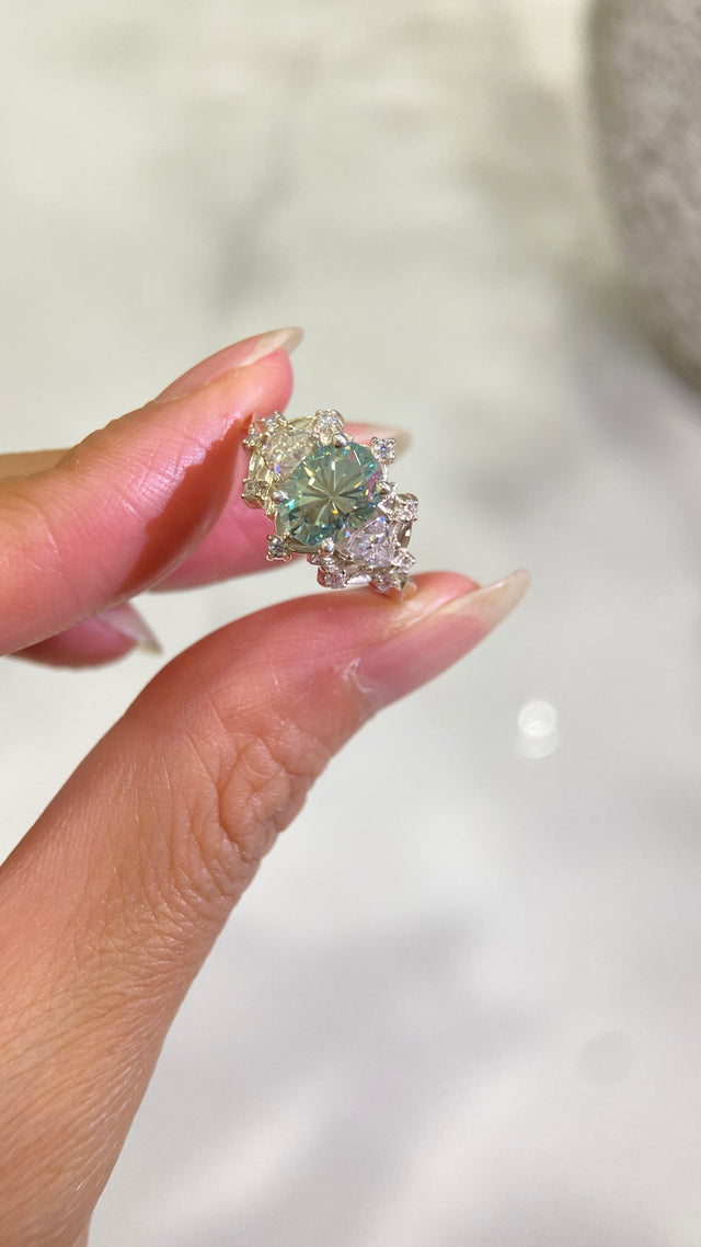 Platinium 900; 2 trillion diamond 4mm; 10 natural diamond 1.1mm and an Oval 6x8mm Teal Lab Grown Diamond