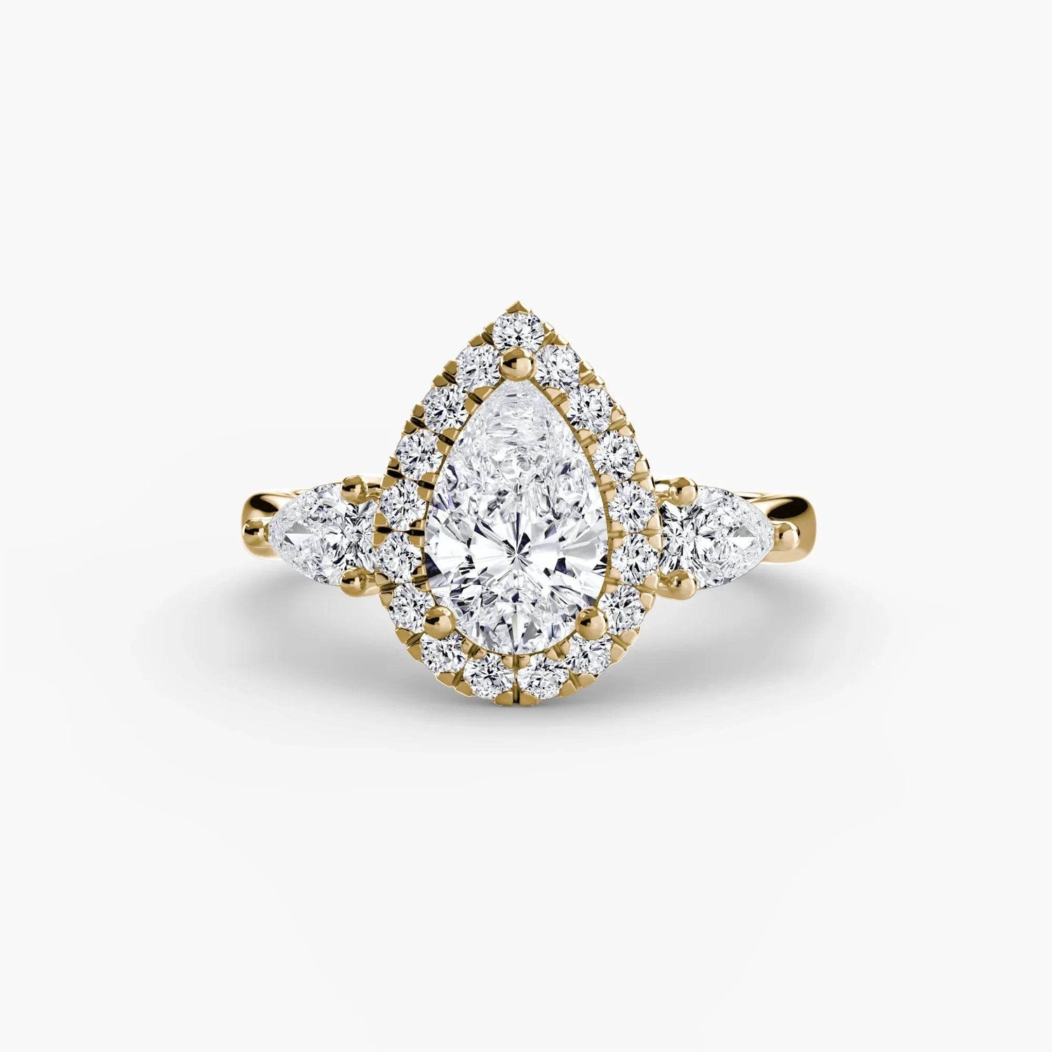 Three-Stone Ring with Halo - 14K White Gold / Pear is backordered and will ship as soon as it is back in stock.