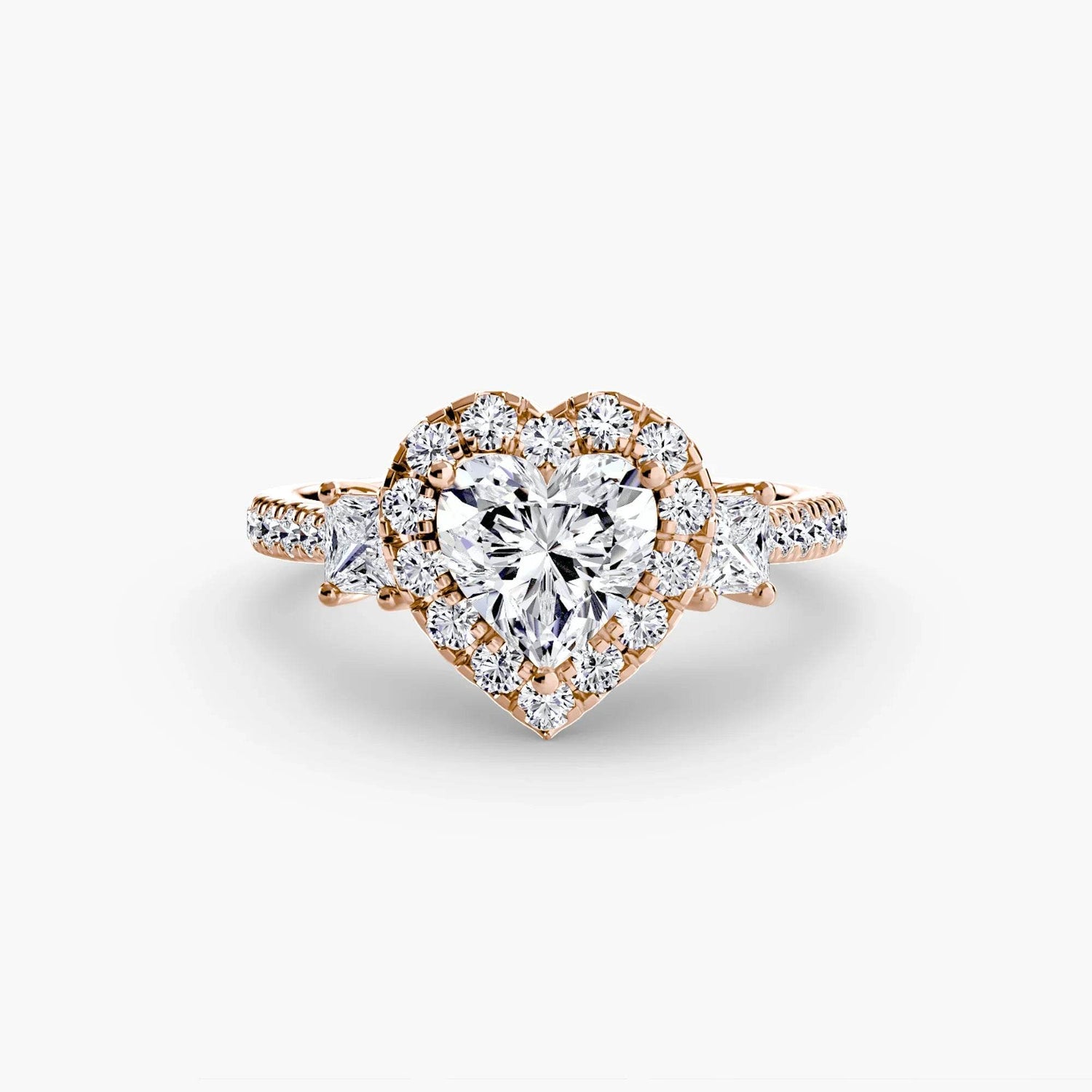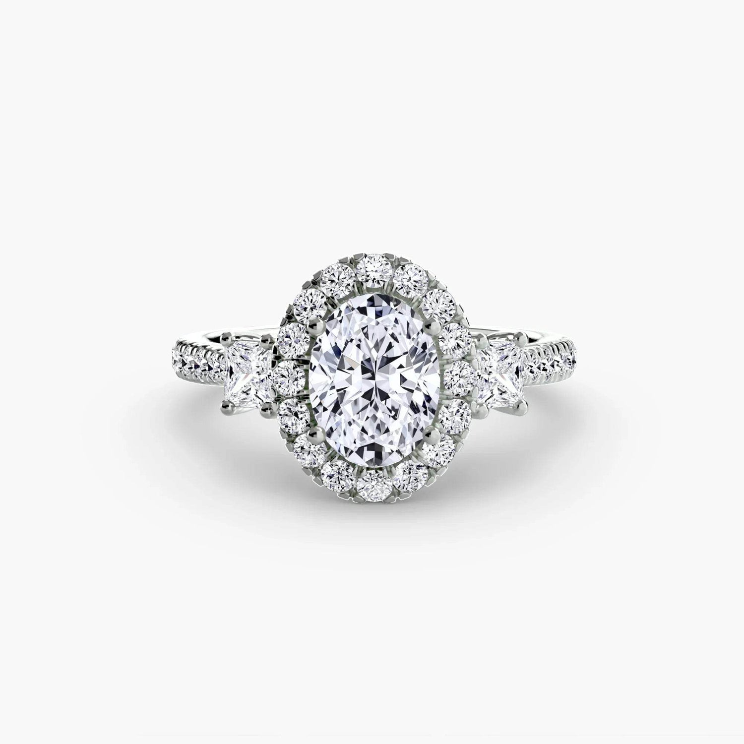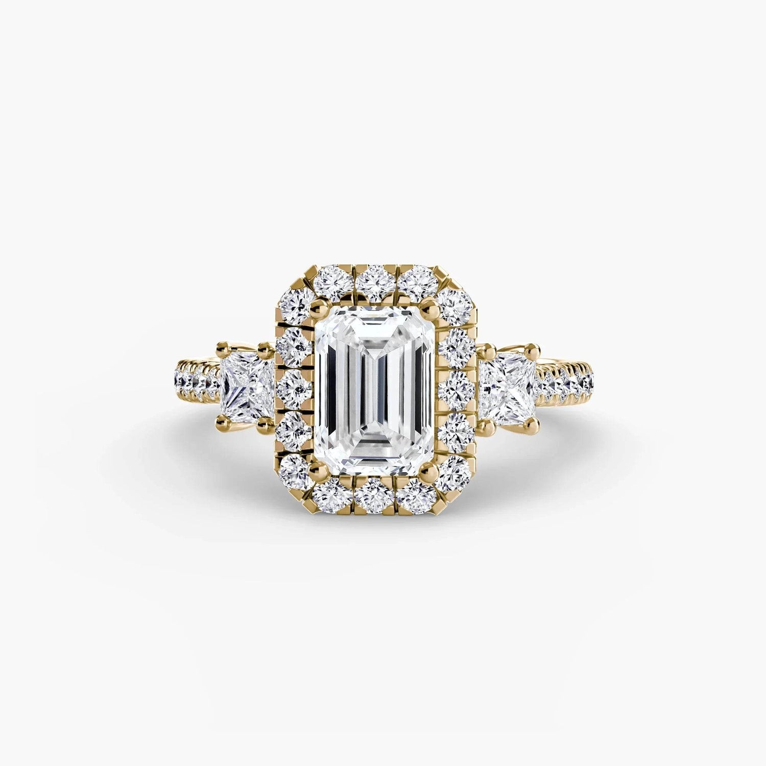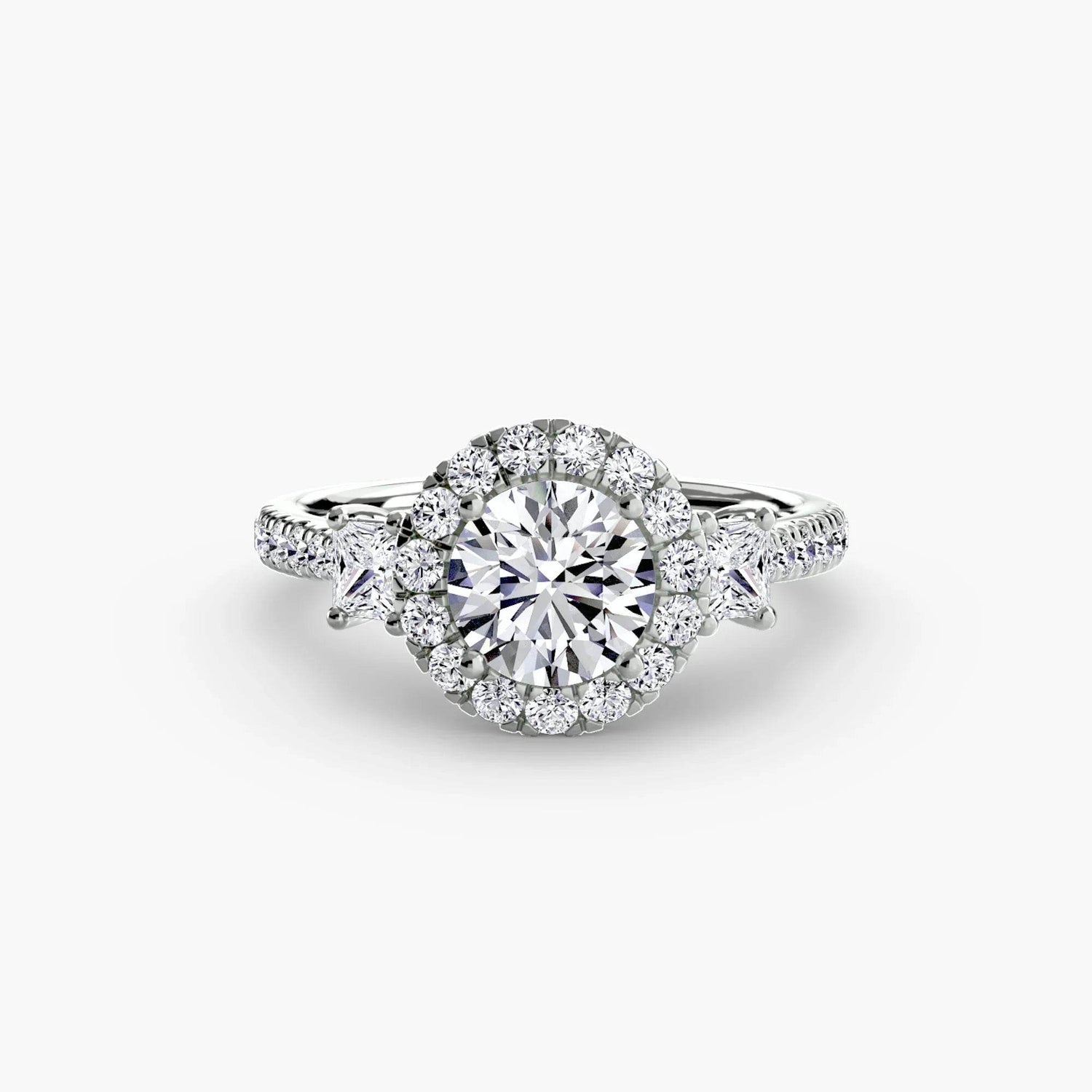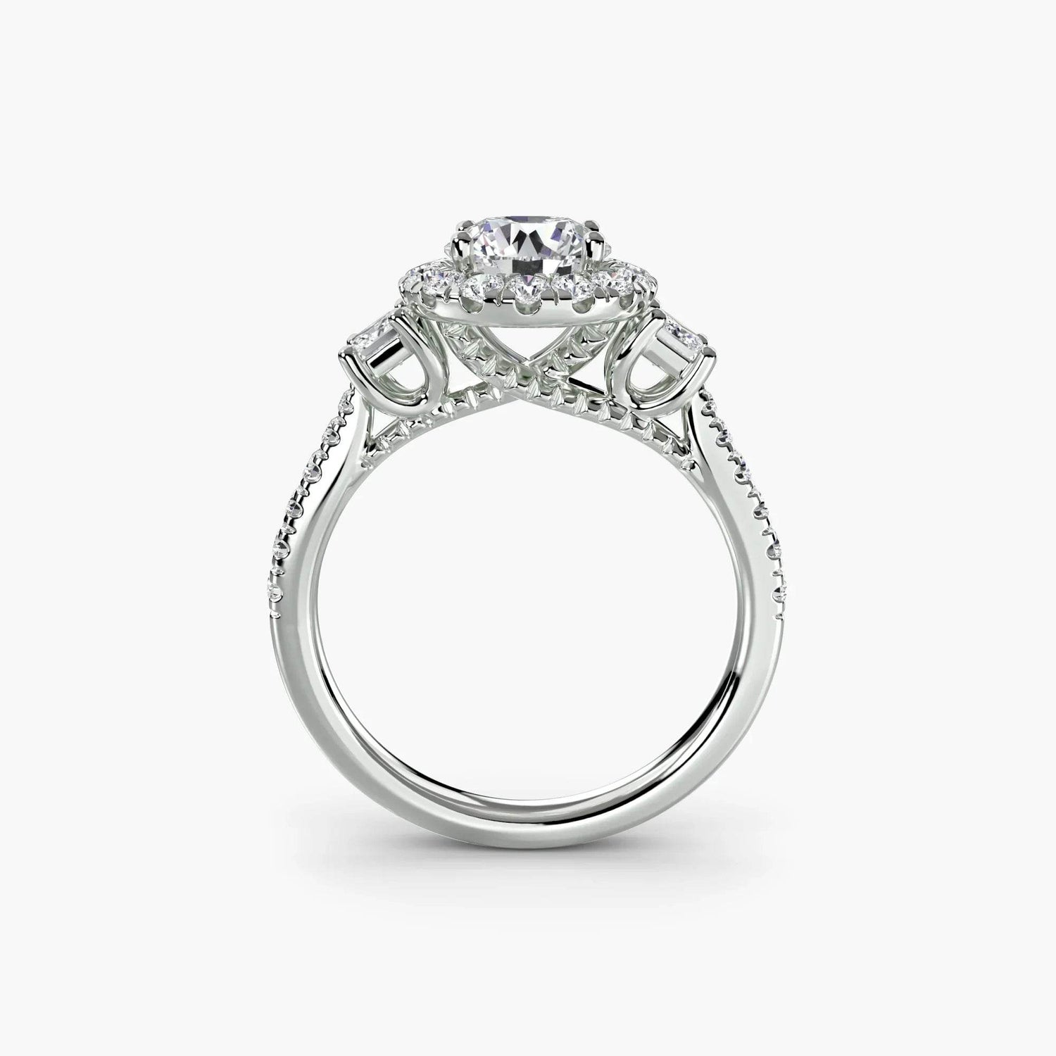 A unique take on the classic three-stone ring, this design is enhanced with a radiant halo for amplified brilliance and symbolism. Timeless with a modern twist.